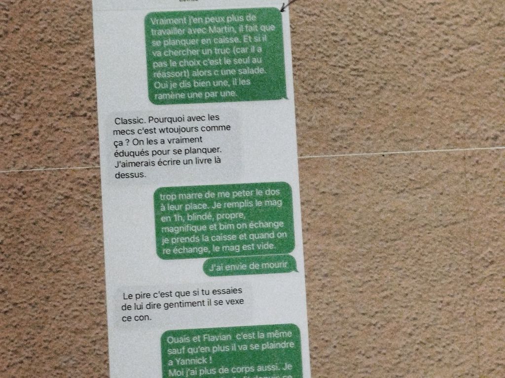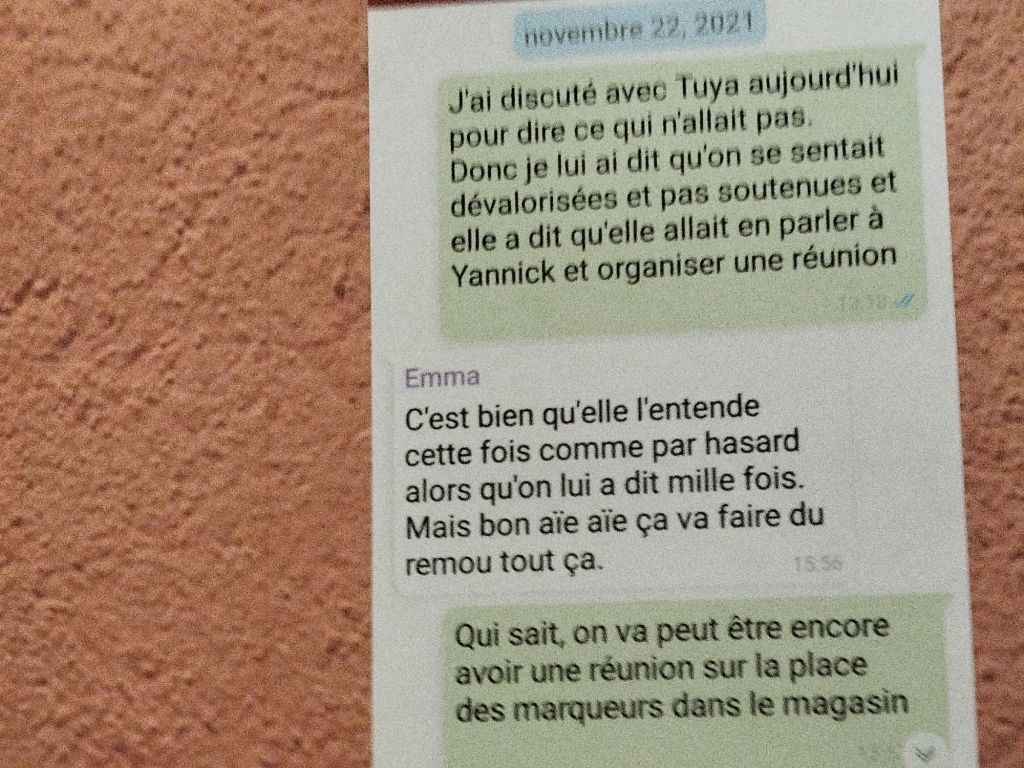 « On a entre 8 et 10 tonnes de port et le magasin n’est pas adapté selon l’ Inspection du travail », ajoute Bethsabée. Cette salariée que Y a pris en grippe faisait la pire journée avec des ports de charge importants. Ce qui la mettait en danger en plus d’une exploitation manifeste. Cette Scop initialement agréable pour travailler était devenue un lieu toxique où les initiatives personnelles étaient sans cesse bridées, la bonne ambiance mise à mal, l’autoritarisme croissant…